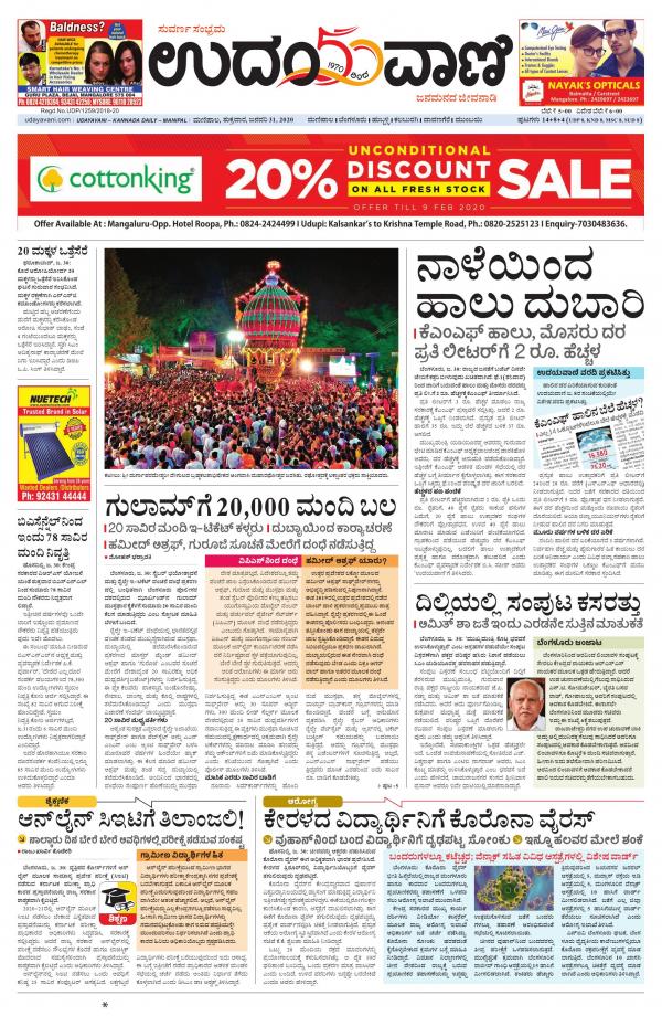 Get Your Digital Copy Of Udayavani Kannada Daily Bangalore February 02 2020 Issue